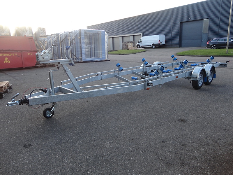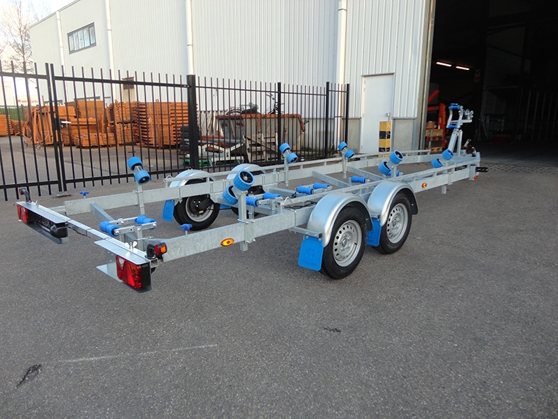 • De boottrailer is voorzien van twee geremde Knott 1350 kilogram assen. Deze zijn verzinkt om te beschermen tegen roestvorming. Dit type as is rubber geveerd, uitgerust met een mechanisch remsysteem en voorzien van waterdichte lagers.